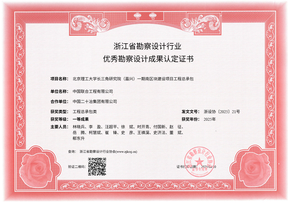 8月18日,浙江省勘察設計行業協會2025年優秀勘察設計成果獎評選結果揭曉,上海二十冶承建的北京理工大學長三角研究院(嘉興)一期南區塊項目榮獲工程總承包類一等成果。
